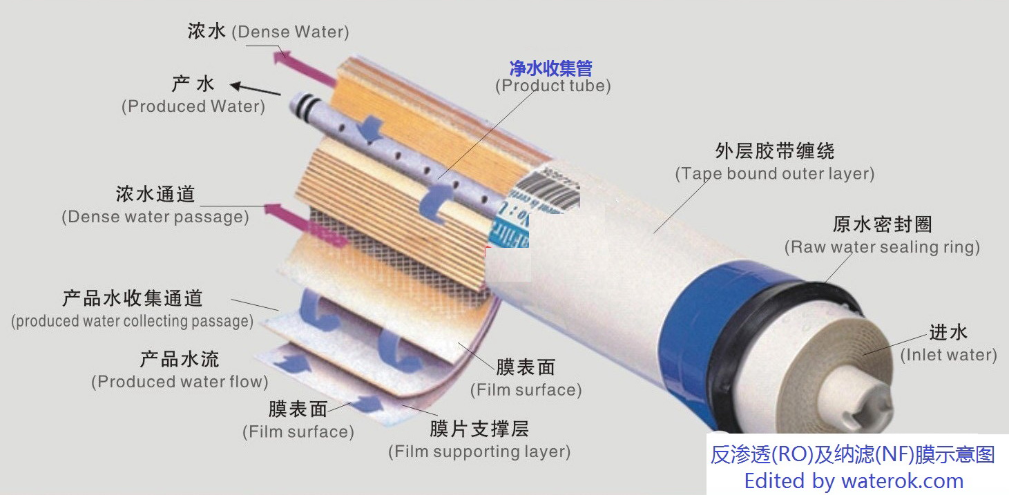* [" Y3 T4 j- |3 r* o6 X2 `- O1.3 反渗透膜(RO) RO是英文Reverse Osmosis Membrane的缩写,中文意思是:反渗透/逆渗透,一般水的流动方式是由低浓度流向高浓度,水一旦加压之后,将由高浓度流向低浓度,亦即所谓逆渗透原理。由于RO膜的孔径是头发丝的一百万分之五( 0.0001 微米) , 一般肉眼无法看到,细菌、病毒是它的5000倍,因此,只有水分子能够通过,其它任何杂质、离子、及重金属均由废水管排出,产水为纯净水。所有海水淡化的过程,以及航天废水回收处理均采用此方法。