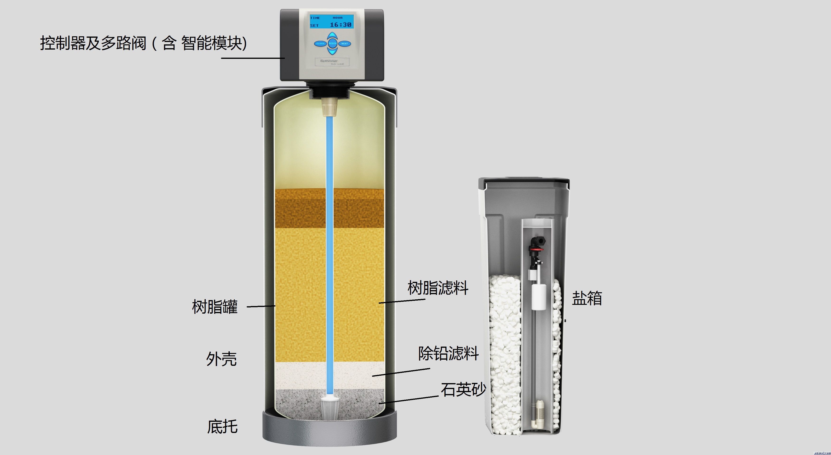 ) m% }% Z6 p$ S* @, `& ~# l图中所示的软水器就是用来去除自来水硬度的设备( 也被称为软化器、软水机等),关于软化的基本原理和流程请参考这里(什么是软水(软化)?为什么要软化?常用的软化方法有哪些?),其他的问题可以看看这里-常见问题。/ @- ~- {: C" w) R4 r